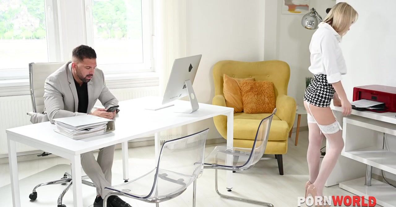 «Худенькая блондинка собиралась всего лишь подрочить на рабочем месте, но случилось так, что она занялась сексом с начальником. Босс её застал за мастурбацией на столе, стройная работница как раз теребила свою писю пальцами, получая удовольствие, но от ебли она отказываться не стала. Возбужденная до придела телка с маленькими сиськами взялась делать минет руководителю и отдалась в бритую пизду на столе.»