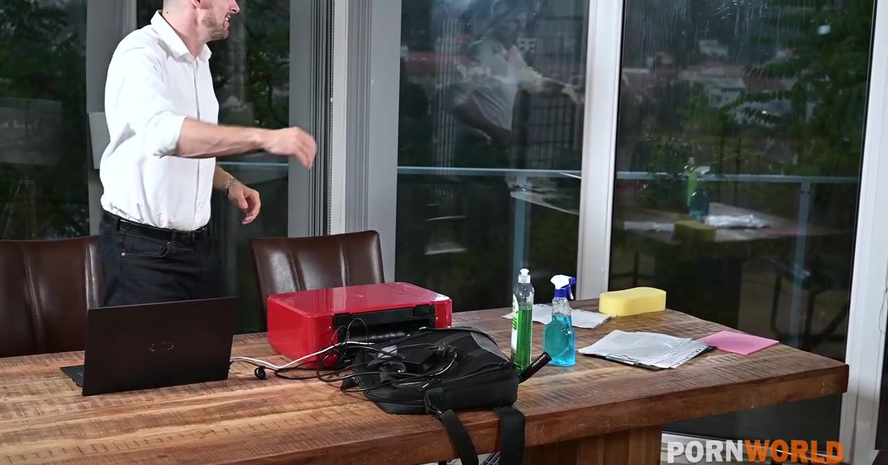 Секретарша моет окна и соблазняет на секс босса и заместителя