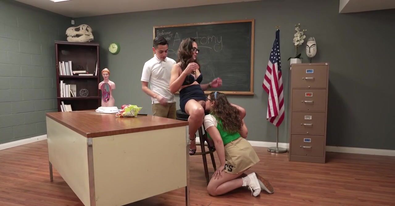 «Привлекательная учительница оставляет после занятий парня и милую девушку в очках. Она обещает их научить действительно важным делам, а именно тому как ебаться и всегда получать удовольствие от секса. Первым делом преподавательница учит паренька делать куни, снимая перед ним трусики. Это же самое делает и девушка. Пилотку училки вылизывает и девчонка и пацан, а потом она учит телочку правильно сосать член.»