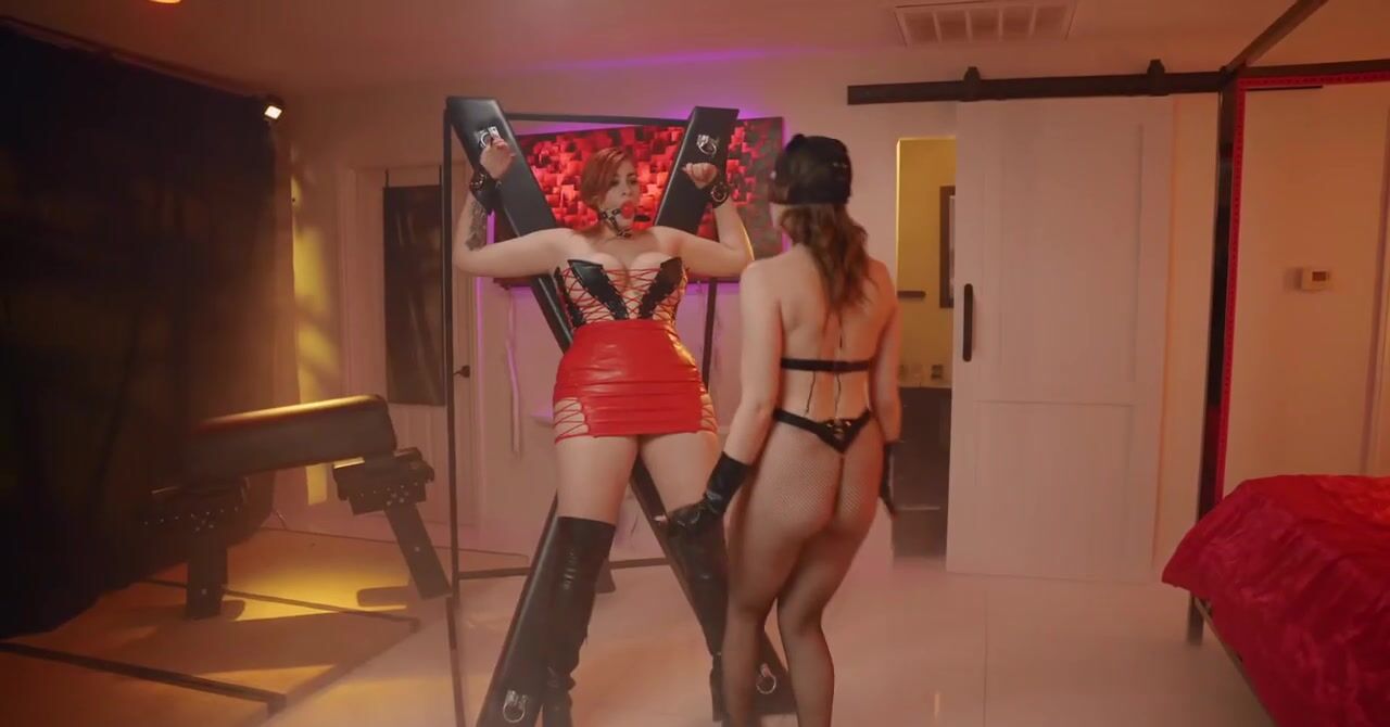 Рыжая телка привязывает подругу к кресту перед сексом в стиле БДСМ
