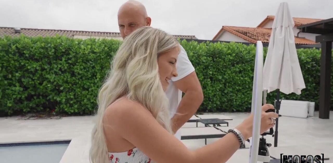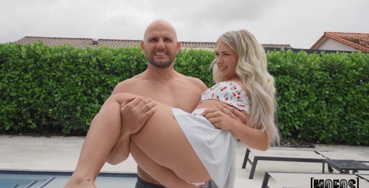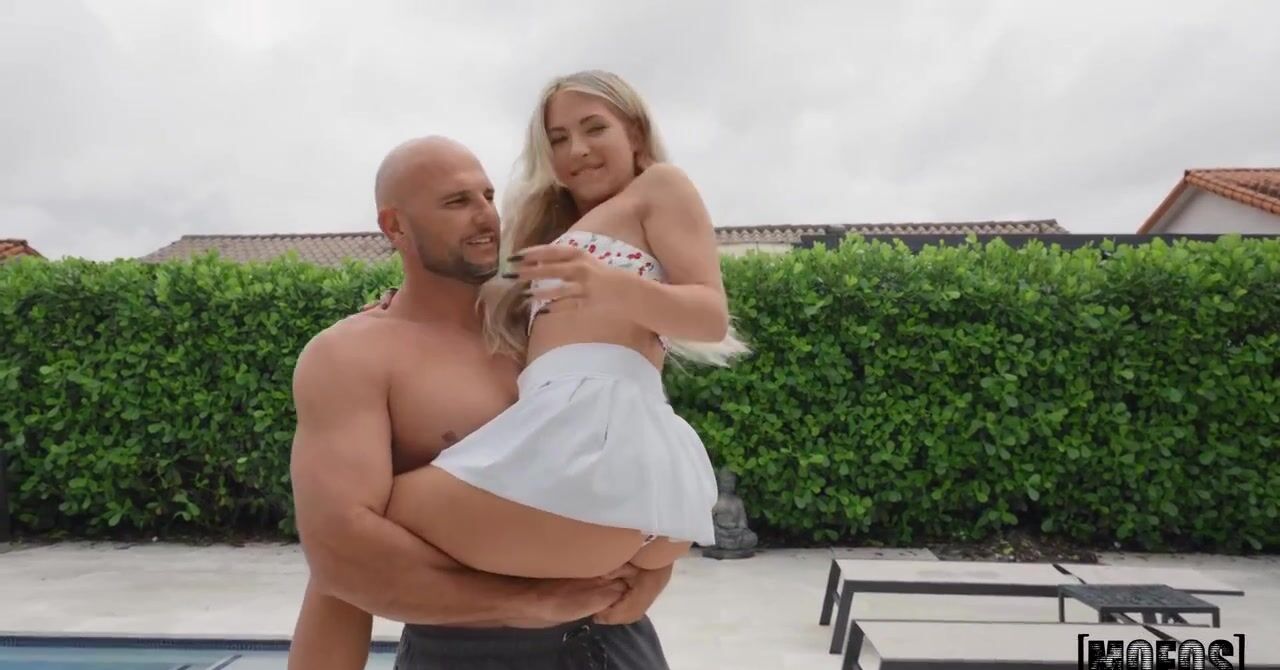 «Белокурая милашка Emma Bugg сняла тикток возле бассейна и ненароком возбудила лысого мужлана, который легко взял её на руки. Будучи зажатой в сильных руках, блондинка с маленькими сиськами безумно возбудилась и не стала отказываться от спонтанного секса. Самец сорвал с неё одежду и угостил цыпочку своим крепким членом, который она с кайфом отсосала, а потом отдалась в пизденку и насладилась бурной еблей.»