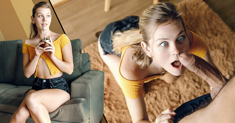 «Стройная блондинка с татуированным телом ведется на вино и составляет компанию парню, который бухает в полном одиночестве. Они вместе выпивают пакет вина и потом идут в гости к чуваку, у него дома ещё есть какой-то алкоголь. Вскоре худышка охотно соглашается на еблю, она пьяная и безумно хочет трахаться. Эта крошка оказывается очень даже развратной, она делает смачный минет и отдается в узенькую пизденку.»