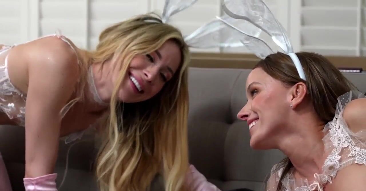 «Две зрелые подруги надевают сексуальное бельё белого цвета и кроличьи ушки плей боя, всё это ради эротической фотосессии. Молодые парни, которые должны были снимать милф, нереально возбуждаются от их образа. Короче говоря, фотосессия так и не началась, ребята возбудились, а зрелые подружки решили с ними заняться групповым сексом. Блондинка с брюнеткой принялись смачно сосать члены ребят и отдались им в пизденки.»