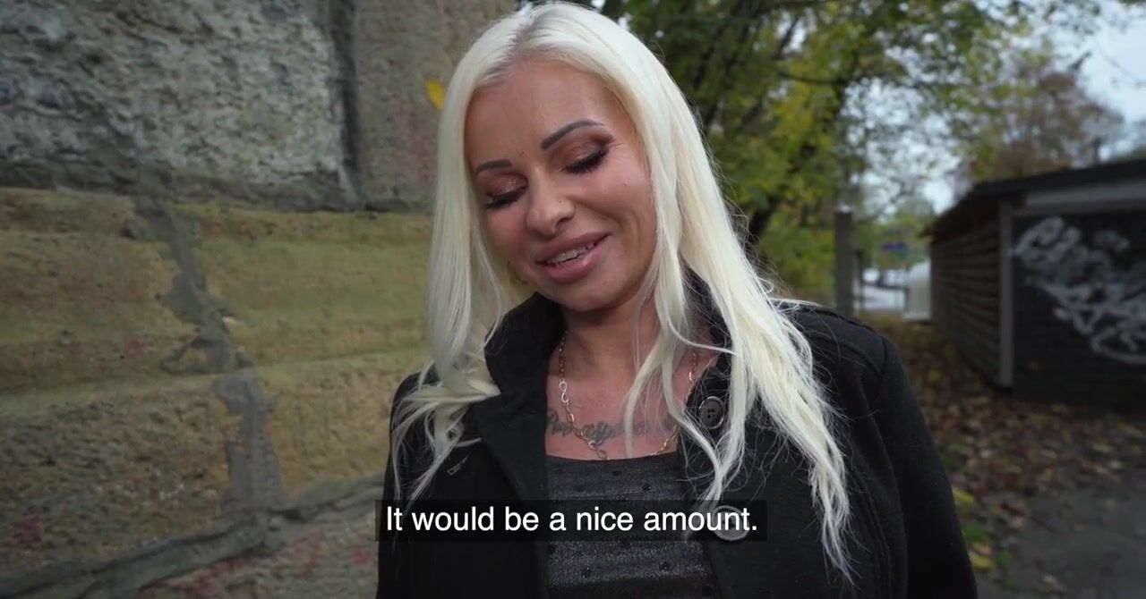 «Зрелая красотка Suzi Grande понравилась пикаперу и он не пожалел денег, чтобы развести её на секс. Белокурая милфа оказалась похотливой и продажной телкой, она согласилась отсосать хуй на улице. Делать минет ей понравилось, хер мужика оказался толстым и крепким. А после оральных ласк зрелка отдалась уже в бритую пизду, получая удовольствие. Её не пришлось просить подставить лицо под сперму, она сама это сделала.»