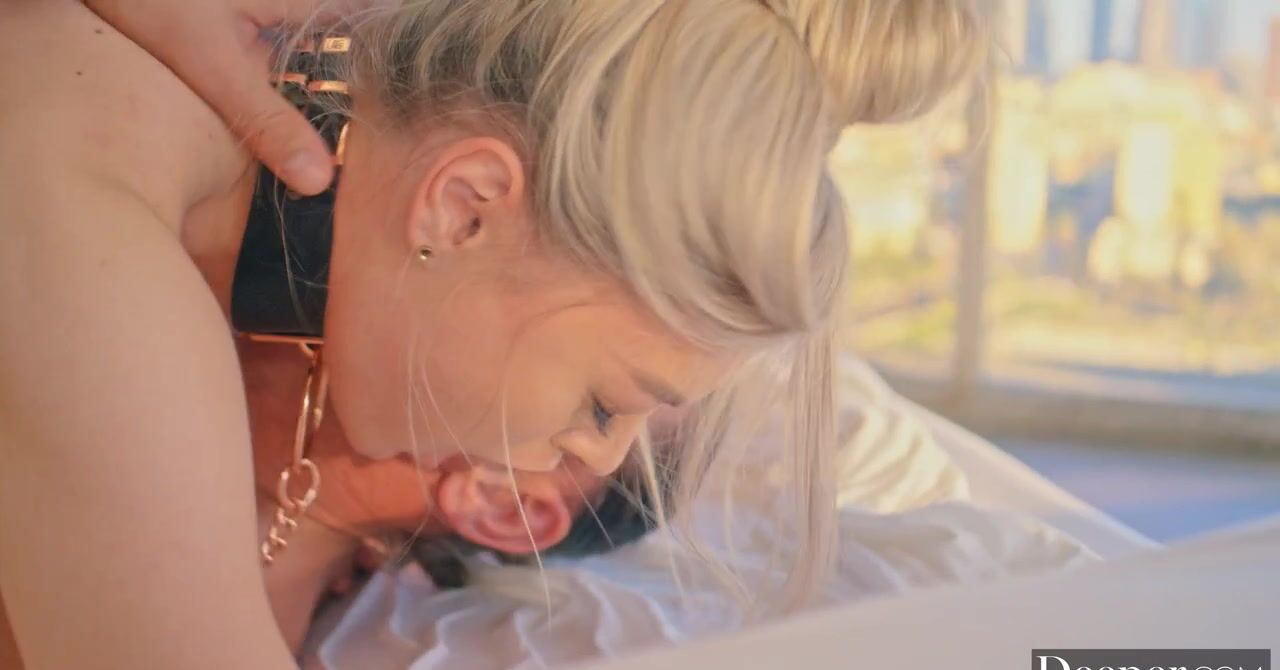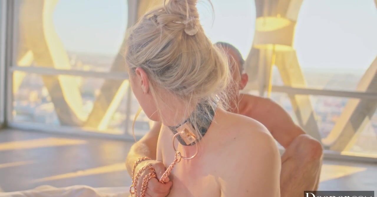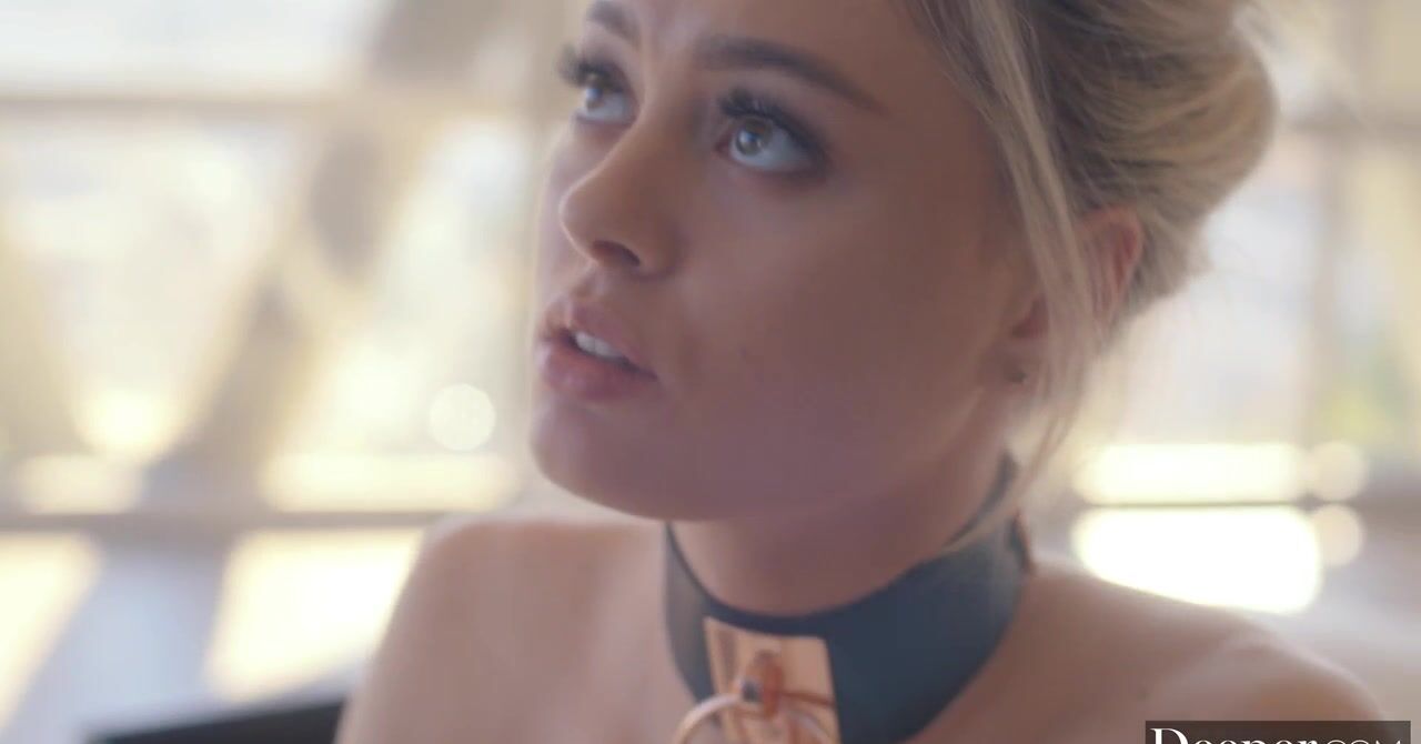 «Послушной красотке Amber Moore приходится надеть ошейник с поводком, чтобы властный господин мог ею управлять во время жаркого секса. Белокурая девушка сама безумно возбуждается, её заводит кожаный ошейник с цепью. Стройная бестия с радостью открывает свой пошлый ротик и принимается делать мужчине минет. Она как следует сосет ствол и отдается в бритую пизденку. Во время жаркой ебли крошка удовлетворяет все желания господина.»