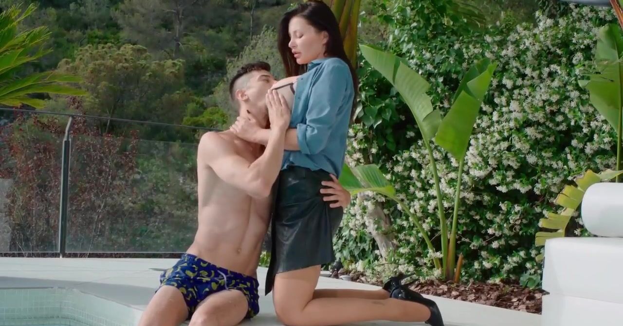 «Идеальная девушка Anna Polina в кожаной юбке сделала парню жаркий минет у бассейна и пригласила его пойти в дом, чтобы там заняться вагинальным сексом. Брюнетка показала как на ней сидит сексуальное бельё черного цвета. Выглядела она нереально соблазнительно, а трахалась ещё лучше. Чел насладился бритой киской проказницы и её ротиком. Та после страстной ебли снова взялась сосать, чтобы попробовать сперму на вкус.»