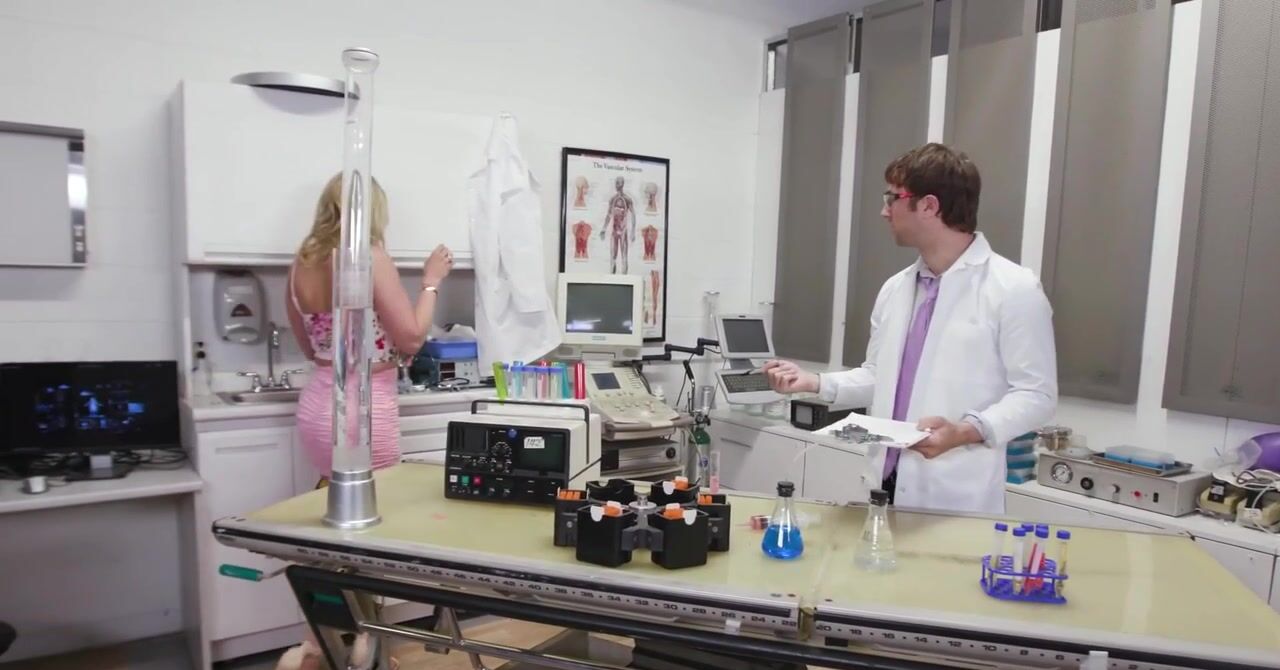 «Уважаемый ученый у себя в лаборатории занимается новым исследованием. А белокурая помощница решает помочь ему расслабиться, мужчина слишком уж сильно увлекся новым проектом и даже почти не спал в последнее время. Зрелая бестия с силиконовыми сиськами довольно быстро его возбудила и отдалась в пизду, а перед вагинальным сексом она сделала ему качественный минет. Ученый поимел помощницу и залил её дойки спермой.»