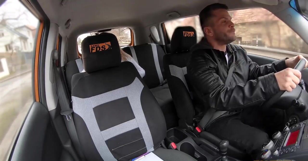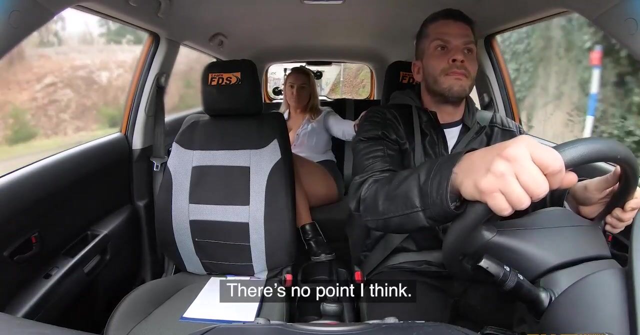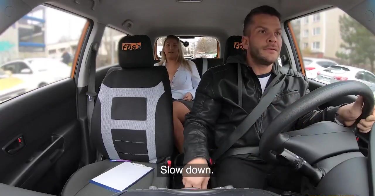 «Парень пытается сдать на права и неплохо ведет машину, но белокурой инструкторше с сочным телом плевать на его навыки вождения. Эта опытная блондинка с большими натуральными сиськами поставит ему хорошую оценку за вождение только в одном случае - если он её отжарит как следует. Что ж, приходится играть по её правилам, мужик угощает опытную сучку членом и трахает её на заднем сидении, а так же лижет бритую вагину.»