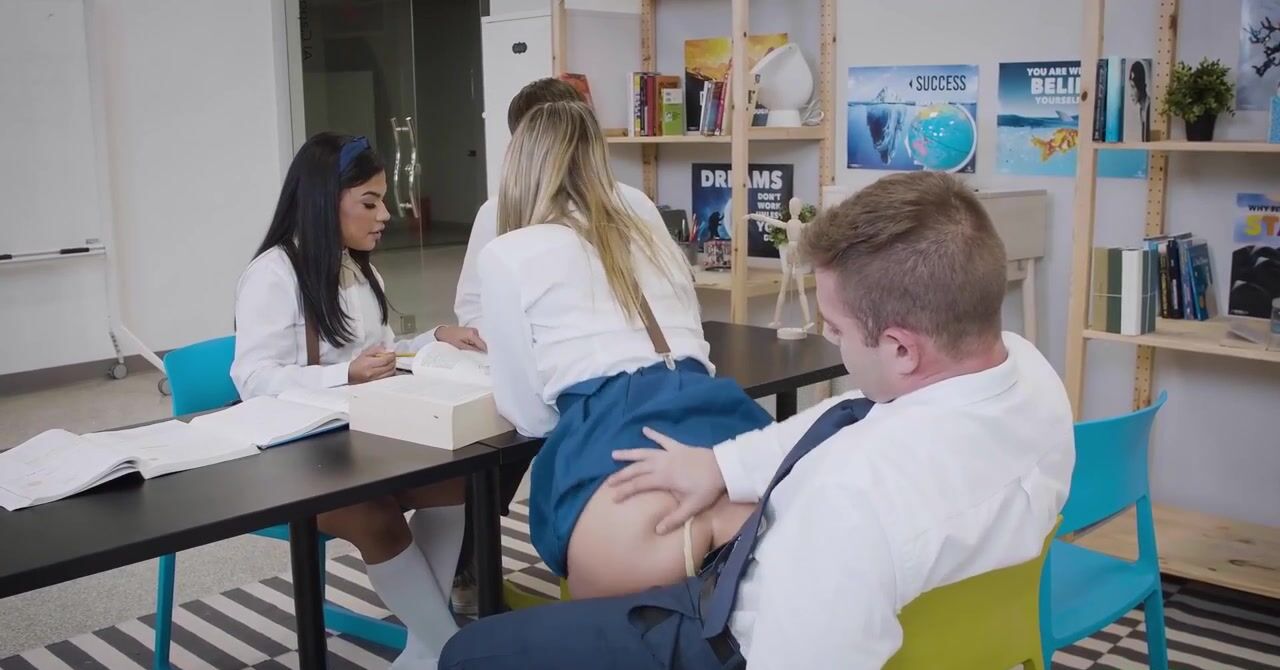 «Стройная студентка во время работы над совместным проектом забирается под стол и там принимается отсасывать член однокурсника. А далее белокурая крошка задирает короткую юбку и насаживается своей влажной киской на его болт. Уже когда другие однокурсники уходят, блондинка может развлечься по полной. Теперь она получает насколько сильный кайф от жаркой ебли, что даже сквиртит, водой из пизды она обильно заливает себя и парня.»