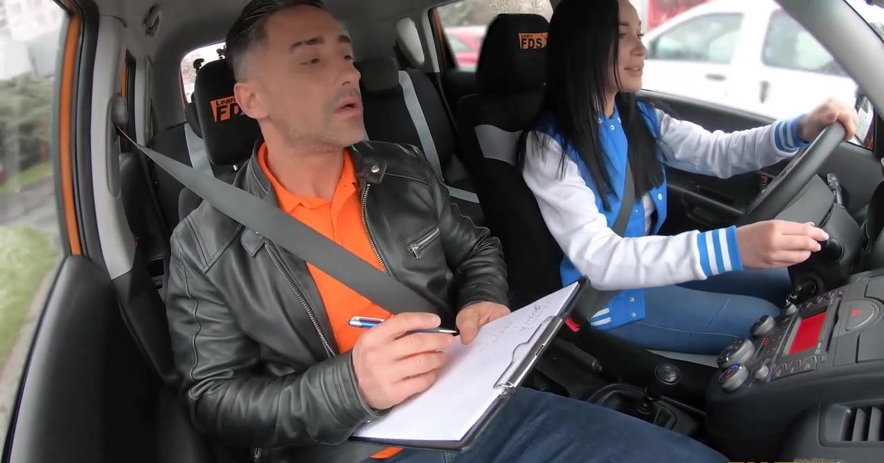 «Девушка неплохо справляется с вождением во время экзамена на права, но инструктор всё равно убеждает её, что будет эффективнее с ним трахнуться, чтобы наверняка сдать экзамен. Парень достает свой член и тихонько дрочит на привлекательную брюнетку пока та сидит за рулем. Уже вскоре черноволосая крошка берет в ротик его крепкий хуй и принимается делать жаркий минет, как следует полируя фаллос, а после минета и в киску отдаться можно.»