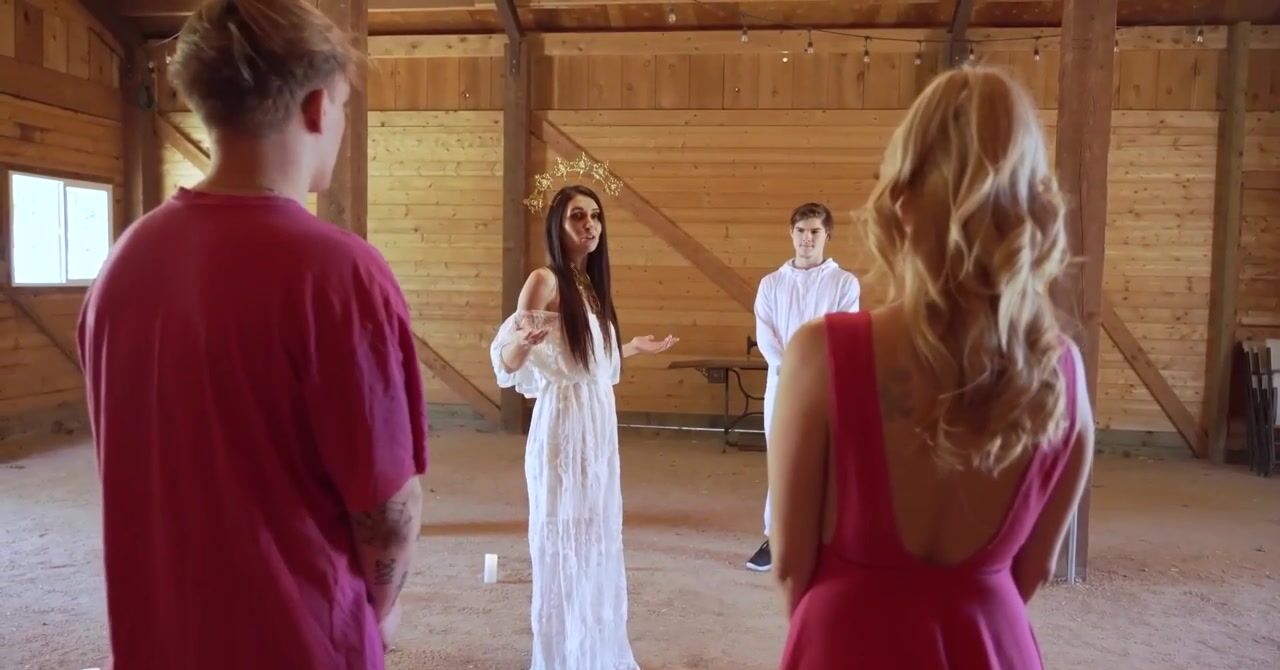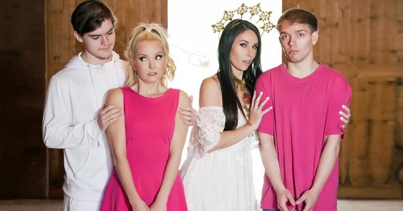 «Брюнетка основала культ, чтобы ебаться. Первыми её приверженцами стала белокурая подруга и два молодых парня. С ними черноволосая владычица и решила трахаться. Она раздела блондинку и ребят, так что уже вскоре две жаркие цыпочки взялись смачно отсасывать крепкие члены молодчиков. Далее пацаны отжарили двух милф по очереди. Пришлось кончать им в киски, так было нужно, чтобы закончить обряд посвящения.»