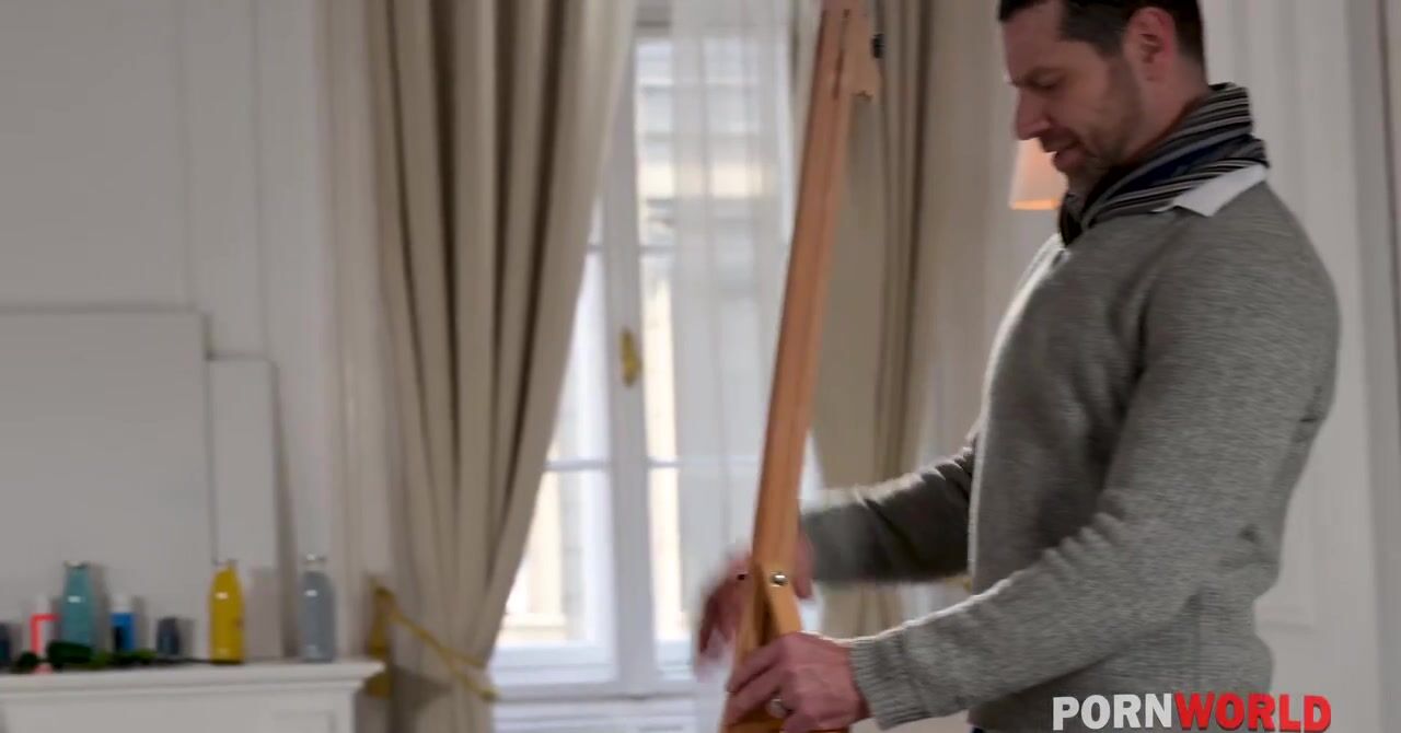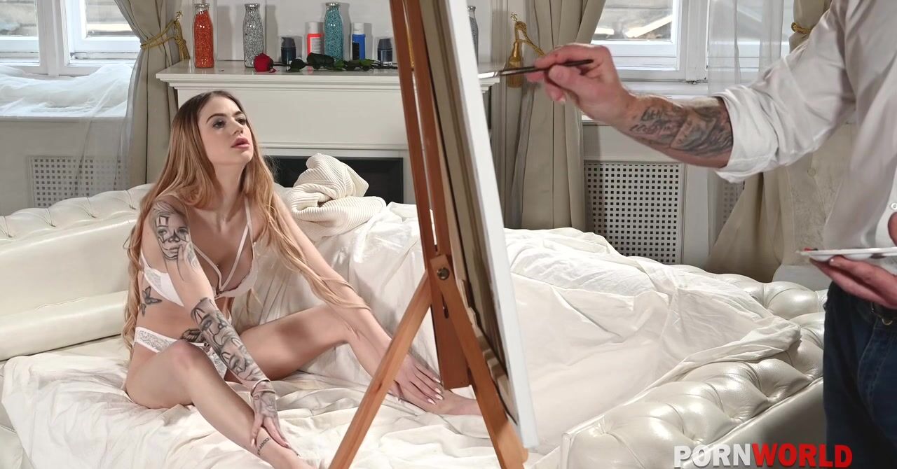 «Татуированная блондинка с татуированным телом решает раздеться полностью пока художник рисует её портрет. Белокурая красотка с силиконовыми сиськами позирует очень откровенно, расставляя ножки в стороны и лаская бритую писю. Художник не может устоять перед соблазном, он угощает крошку своим членом и наслаждается её умелым ротиком. Худышка сделала ему прекрасный минет и отдалась в бритую киску, получая удовольствие.»