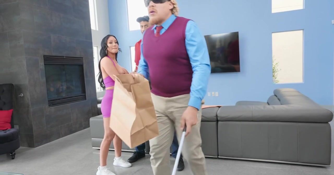 «Слепой муж не видит чем там жена занимается с курьером. А эта привлекательная брюнетка ласкает его большой черный член, который потом принимается страстно отсасывать. Уже вскоре ненасытная красотка с силиконовыми сиськами отдалась ещё и массажисту, наслаждаясь теперь групповым сексом. Милфа так возбудилась, что отдалась во все дырочки, наслаждаясь двойным проникновением. Неверная супруга кайфонула по полной.»