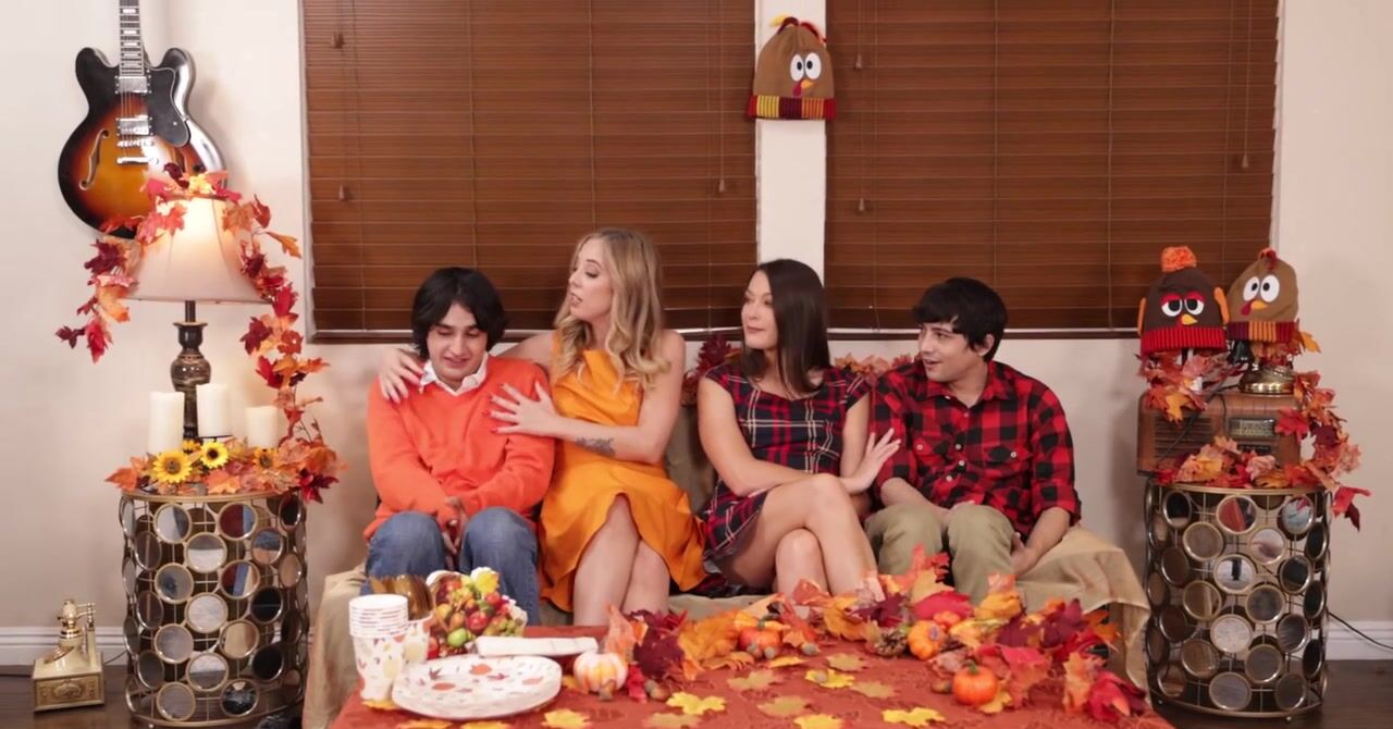 «Зрелые красотки отпраздновали день благодарения с пасынками и сделали этот праздник незабываемым. Стройная брюнетка с маленькими сиськами и её белокурая подруги обменялись пасынками и занялись с молодыми ребятами групповым сексом. Эти проказницы оказались прекрасными любовницами, так что ребята кайфонули по полной программе. Не будет преувеличением сказать, что это был лучший секс в жизни чуваков.»