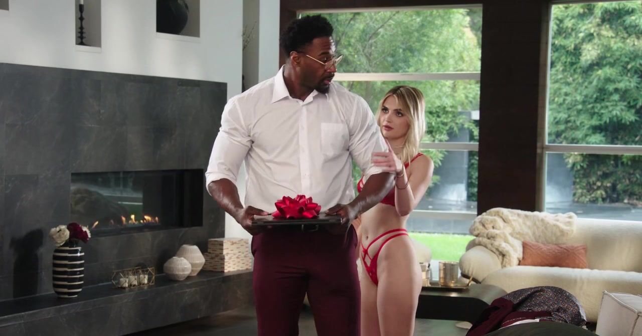 «Теперь можно не скрываться и наслаждаться сексом со страстной любовницей по полной программе. Черный муж отправил женушку на отдых, а сам резвится с миниатюрной красоткой. Блондинка с маленькими сиськами моментально его возбуждает и набрасывается на большой черный член, который она как следует отсасывает. А далее цыпочка уже отдается в узенькую киску. Стройная развратница насладилась еблей по полной.»