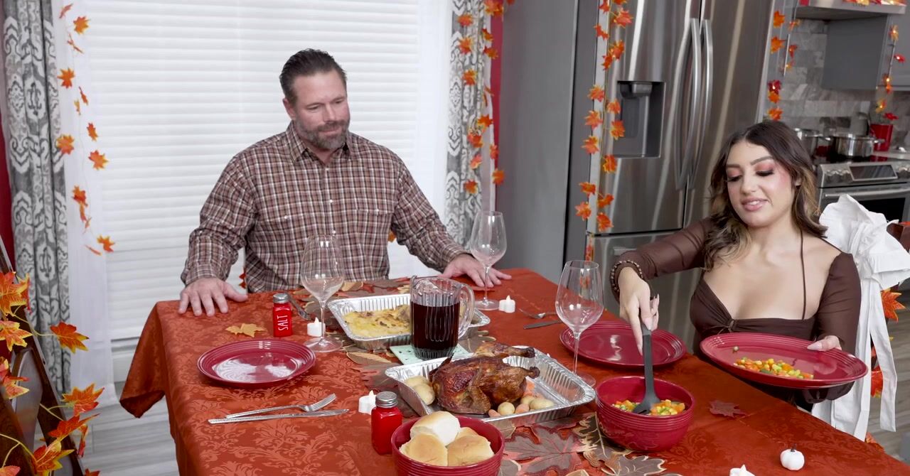 «День благодарения в этом году проходит только с падчерицей, которая решила не оставлять отчима в одиночестве и составила ему компанию. Уже вскоре белокурая милашка ложится на стол и расставляет ножки в стороны. Её влажная киска — главное блюдо этого вечера, поэтому папочка может ей отлизать, а потом трахнуть проказницу. Мужик это и делает, он отполировал щелку, а потом поимел худышку в пизду и в глотку.»