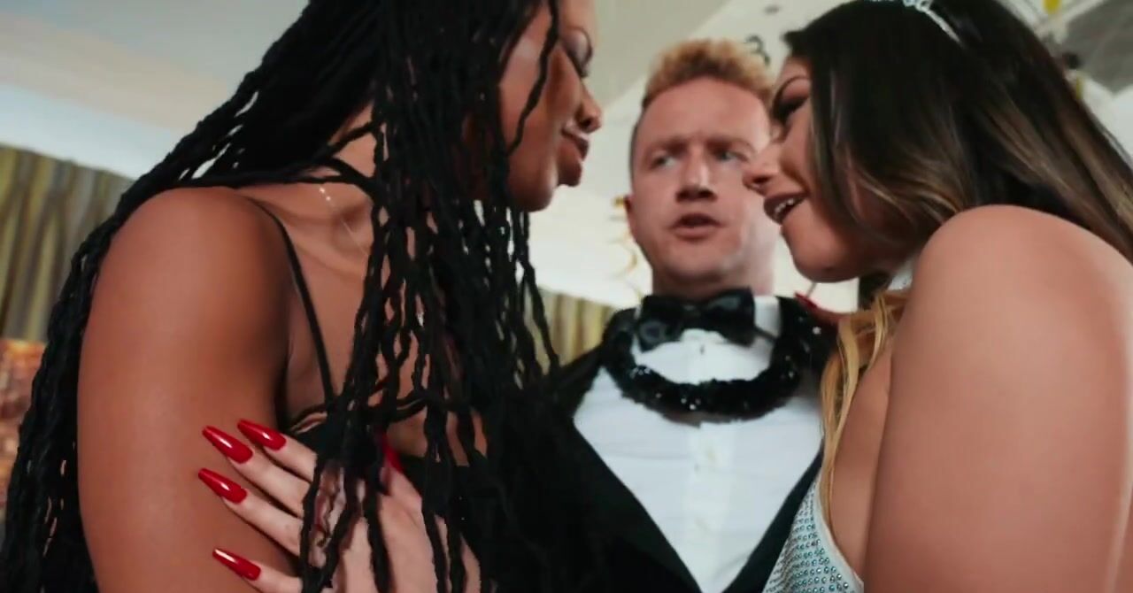 «Новогодняя вечеринка удалась на славу. На ней парень изменил своей девушке с двумя развратницами. Черная бестия с силиконовыми сиськами и белая худышка повели чувака в спальню и там отдались ему в киски. Эти развратницы стали первым делом очень страстно отсасывать твердый член парня, а потом отдались ему в мокрые пизденки. Чувак так ещё никогда не кайфовал, в прочем как и девки, которым тоже безумно понравилось ЖМЖ.»
