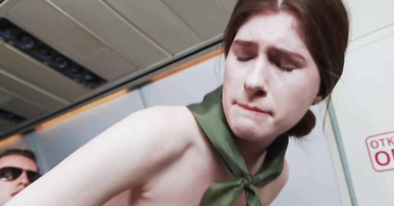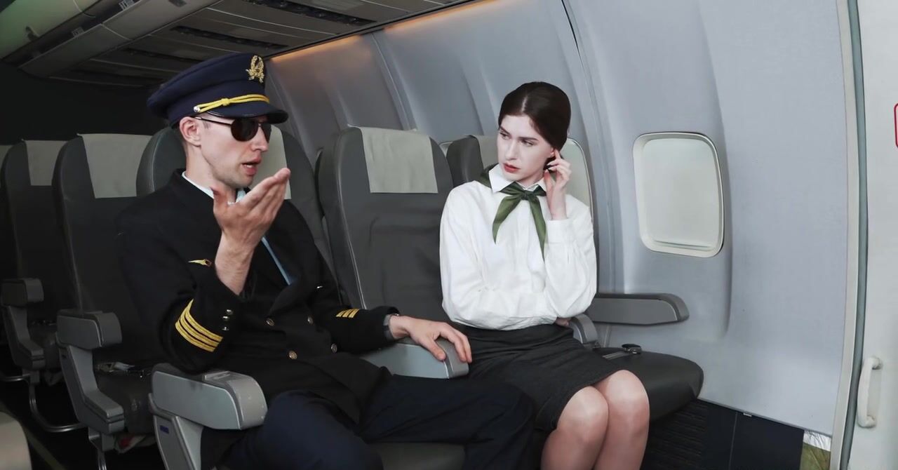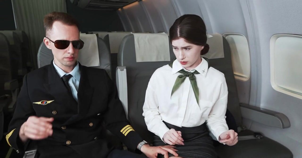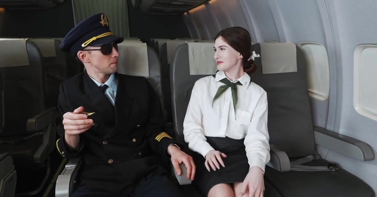 Милая стюардесса с белоснежной кожей отдается пилоту в самолете
