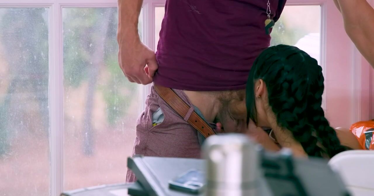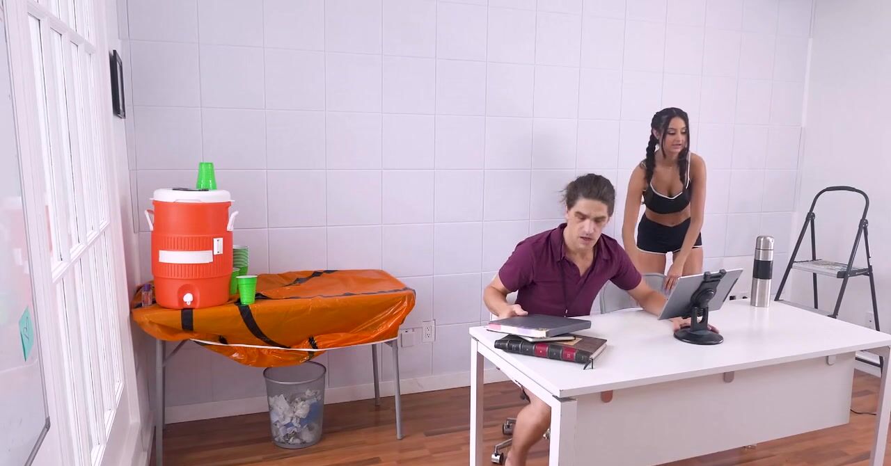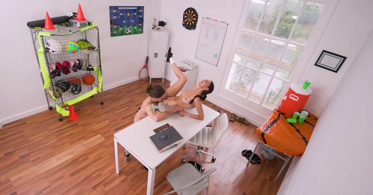 «Красивая студентка с косичками очень хочет получить высокую оценку по физкультуре, а вот ходить за занятия она не желает. Что ж, в таком случае молоденькая красотка может удовлетворить учителя своим ротиком и киской. Брюнетка с радостью это делает, учитывая размер хуя преподавателя. Он у чувака большой и крепкий, так что худышка с идеальным телом получает нереальный кайф не только от вагинального секса, но ещё и от минета.»