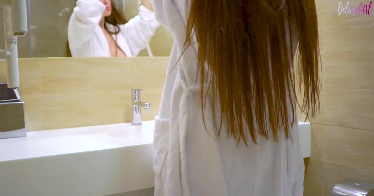 Красотка готовится ко сну и ласкает киску в ванной комнате