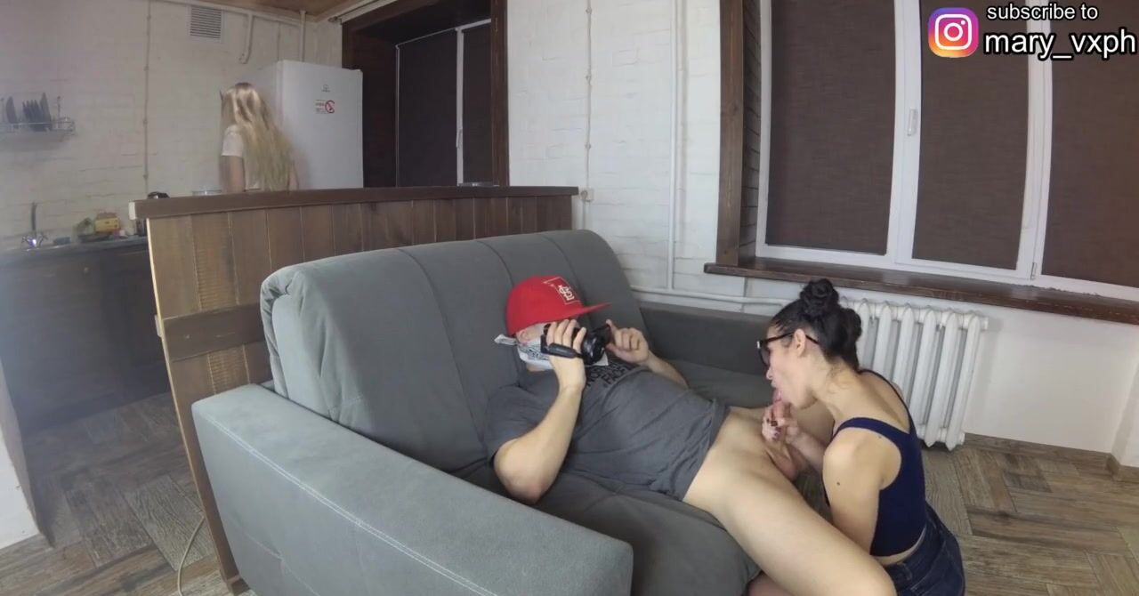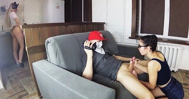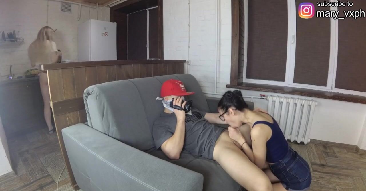 Пока девушка на кухне, член парня сосет её подруга
