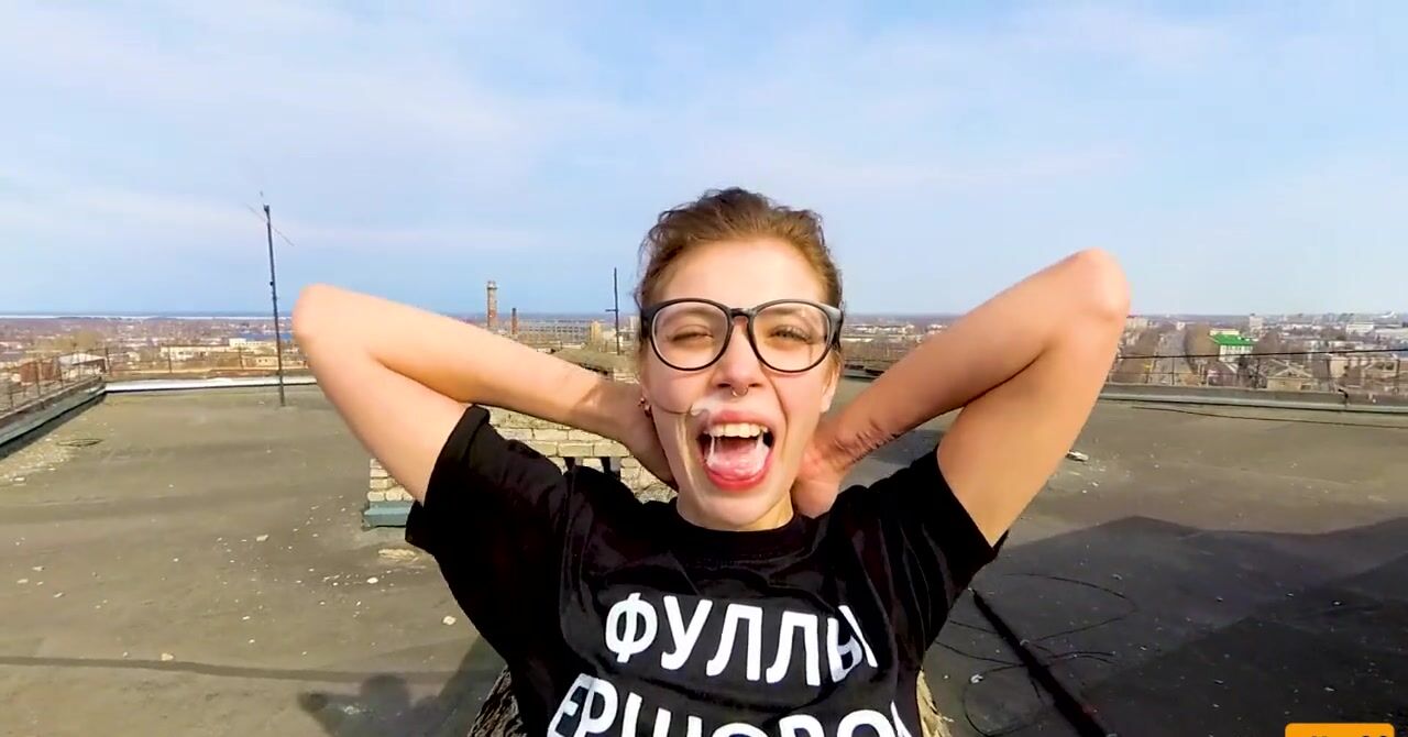 «Изначально парень подумал, что привлекательная подруга хочет показать ему вид, который открывается из крыши дома. Что именно ради вида они туда и поднимаются. Но уже вскоре оказывается, что всё совсем не так и на самом деле у девчонки более развратные планы. Рыженькая проказница в очках опускается перед ним на колени и принимается как следует сосать хер, после чего встает раком и снимает джинсы, чтобы трахнуться.»