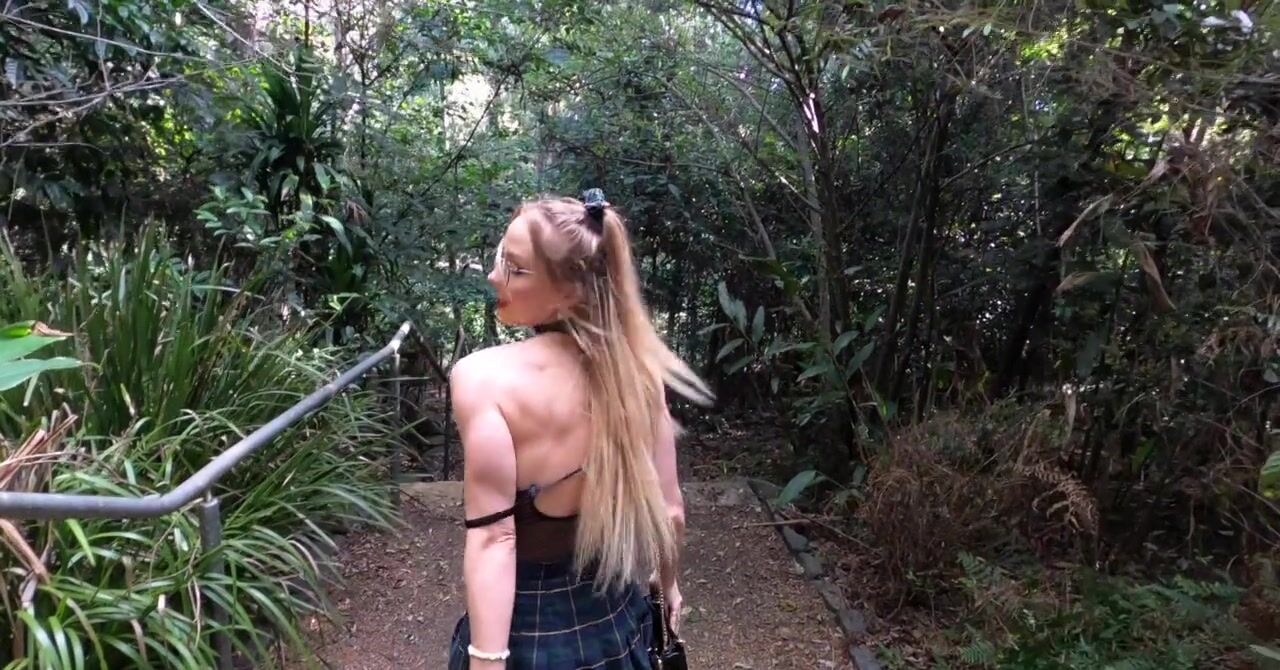 Красотка во время прогулки в парке ублажает себя мастурбацией