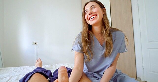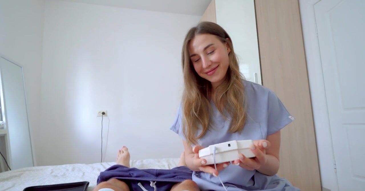«Прекрасная медсестра с красивыми большими сиськами и упругой жопой решает заняться сексом с пациентом по собственному желанию. Привлекательная девка снимает униформу и показывает тело во всей красе, а затем овладевает толстым членом парня. Такой размер ей нравится, девчонка его смачно отсасывает и отдается в киску. Трахается она в разных позах, а сперму проказница готова принимать на своё красивое лицо.»