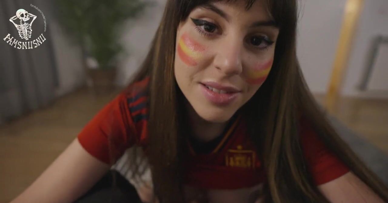 «Красотка составила компанию бойфренду и посмотрела вместе с ним футбольный матч. А для полного погружения, она надела на себя форму любимой команду бойфренда. Выглядела цыпочка на удивление привлекательно и сексуально. Уже вскоре брюнетка решила не просто заигрывать, девка достала хуй и принялась сосать, а так же ласкать его большими сиськами. После этого крошка села киской на фаллос, показывая упругую попку.»