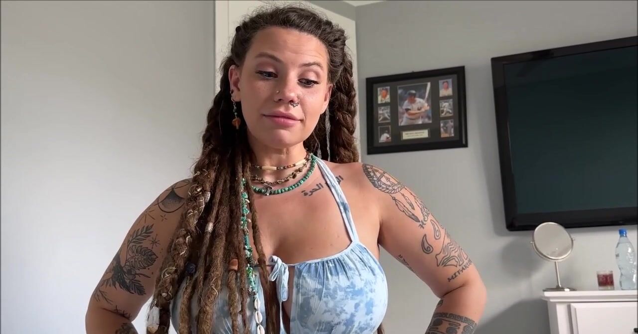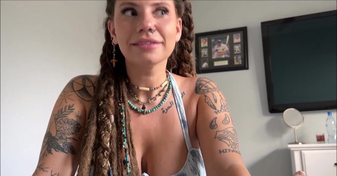 «Сводная сестра стала хиппи и ей импонирует идея свободной любви, поэтому привлекательная девушка и соблазняет на интим братика. Брюнетка с дредами показывает обнаженное тело во всей красе. Её кожу покрывают татуировки, а ещё девка имеет большие натуральные сиськи. Брат возбуждается, хуй становится твердым. Жаркая крошка с пирсингом на лице принимается теперь делать ему смачный минет и отдается в мокрую писю.»