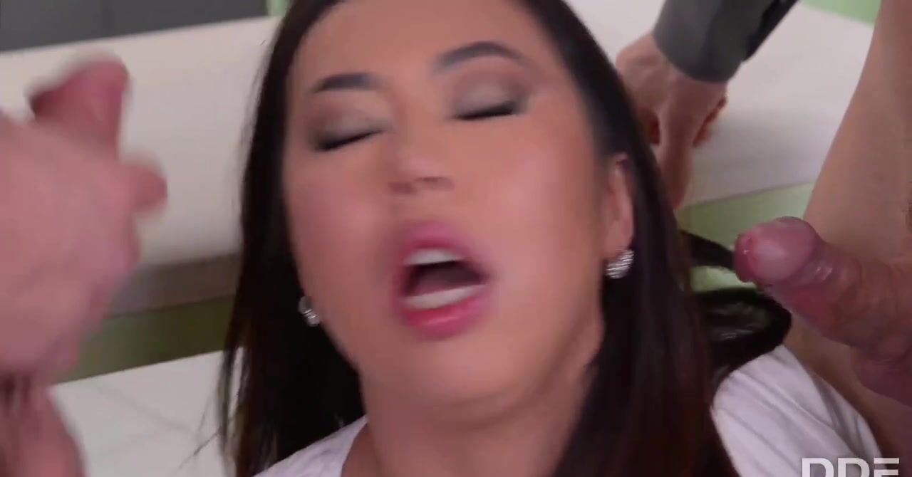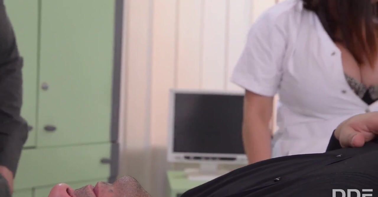 «Друзья приходят в больницу на осмотр и возбуждаются от вида больших сисек медсестры. Эта сочная азиатка не только выглядит соблазнительно, она даже согласна пошалить с двумя мужчинами в кабинете. Жаркая развратница с силиконовой грудью снимает халат, под которым у неё находится сексуальное белье. Развратница берется делать смачный минет и отдается в бритую пизду с пирсингом клитора, получая удовольствие.»
