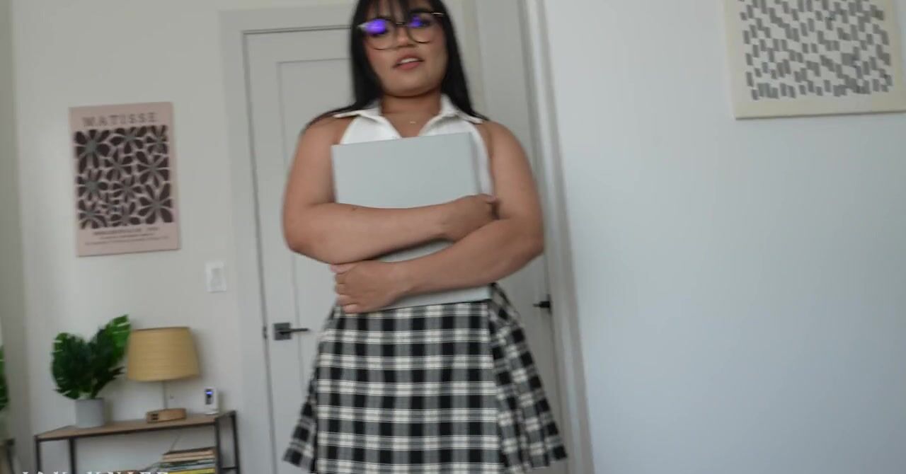 «Милая студентка азиатка пришла к однокурснику в гости, чтобы вместе выучить уроки. Но у девушки немного другие планы, которые она уже вскоре озвучивает. Эта привлекательная крошка задирает юбку и показывает упругую попку, а затем принимается ласкать крепкий член приятеля. Эта милашка ещё и ногами дрочит его фаллос, а так же делает неплохой минет. Развратница вскоре насаживается киской на ствол и получает удовольствие.»