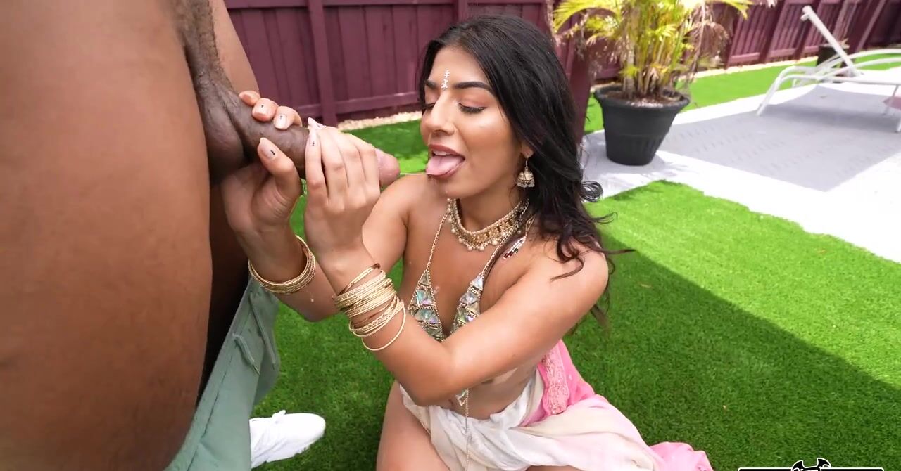 «Индийская красотка с сочной задницей соблазняет негра за межрасовый секс и принимается делать ему прекрасный минет во дворе. Эта смуглая развратница умеет доставить удовольствие, она оказывается нереально развратной и умелой минетчицей. А потом бестия берет черного парня за хуй и ведет его в дом, предлагая трахнуться уже на кровати. Индианка оказывается ненасытной любовницей, которой хочется кончить несколько раз.»