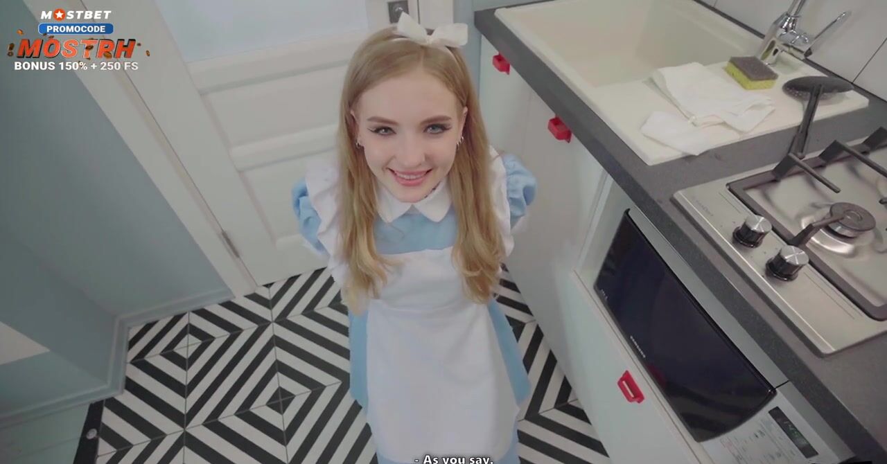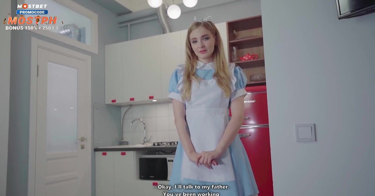 «Парень обещает помочь красивой горничной с надбавкой к зарплате. Он обязательно уговорить родителей платить этой красотке больше, но только в том случае, если девушка поможет и ему. Что нужно сделать? Всё просто, худышка должна отсосать его член, а потом отдаться в бритую киску. Цыпочка не отказывается, она отпускается на колени и как следует полирует хер, а потом отдается в бритую пизду на кухне.»