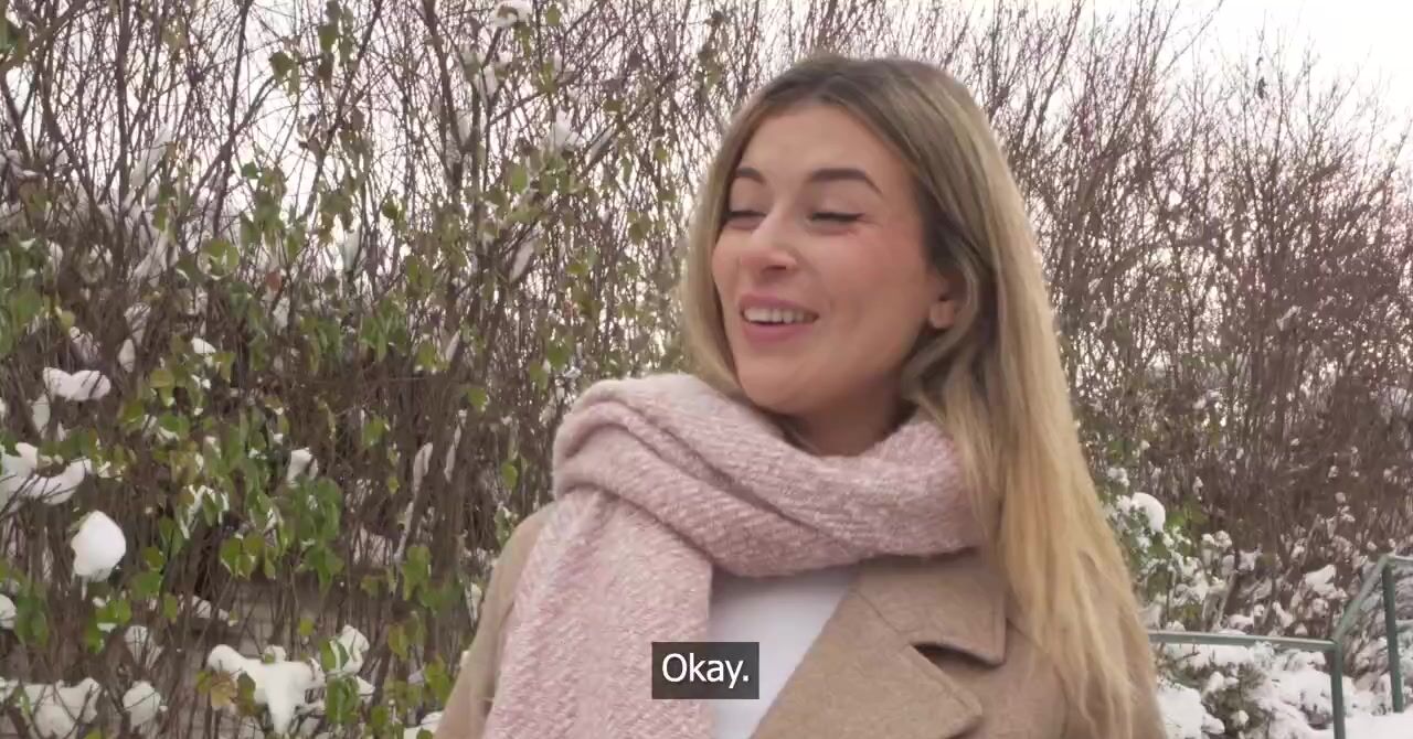 «Красотка за деньги показывает маленькие сиськи на улице и её совсем не смущает, что там довольно холодно. Белокурая худышка с татуированным телом даже опускается на корточки и принимается делать минет на морозе. Телка явно оказывается безумно развратной сучкой, так что мужик приводит её к себе в гости и там наслаждается бритой киской развратницы. Та очень развратной сосет и трахается, сама же кайфуя.»