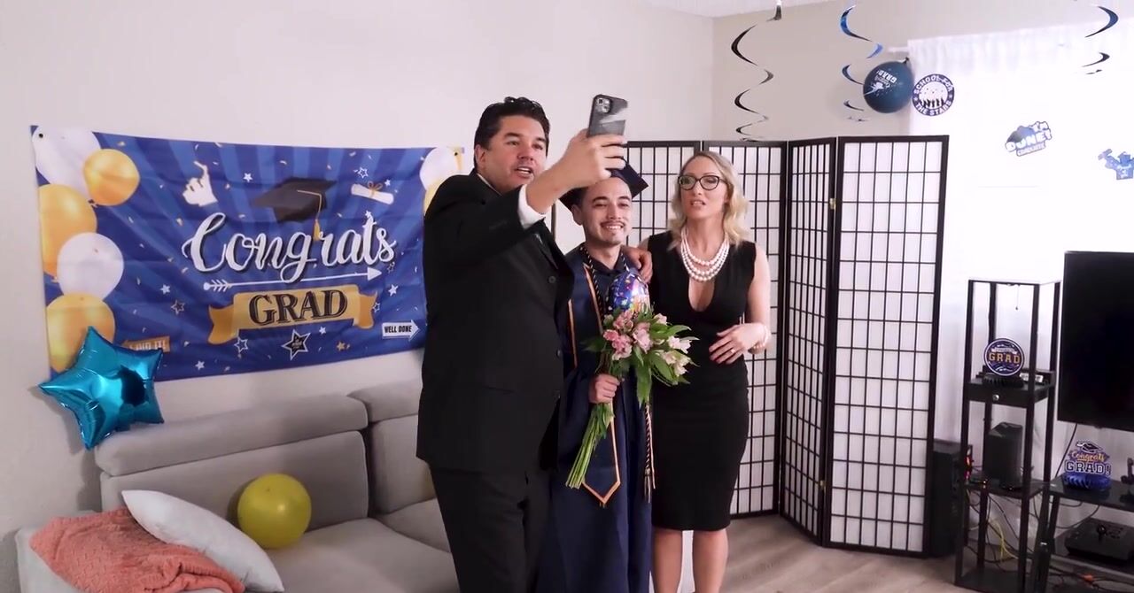 «Мачеха хочет, чтобы пасынок окончил университет, поэтому она решает поощрить его сексом. Пусть муж не мешает, белокурая милфа с силиконовыми сиськами делает это для пасынка, так что супруг должен понять. Эта привлекательная бестия взялась делать пареньку смачный минет и доставила ему удовольствие, а потом отдалась и в киску. Даже после окончания универа, она не перестает с ним ебаться, ей просто понравилось.»