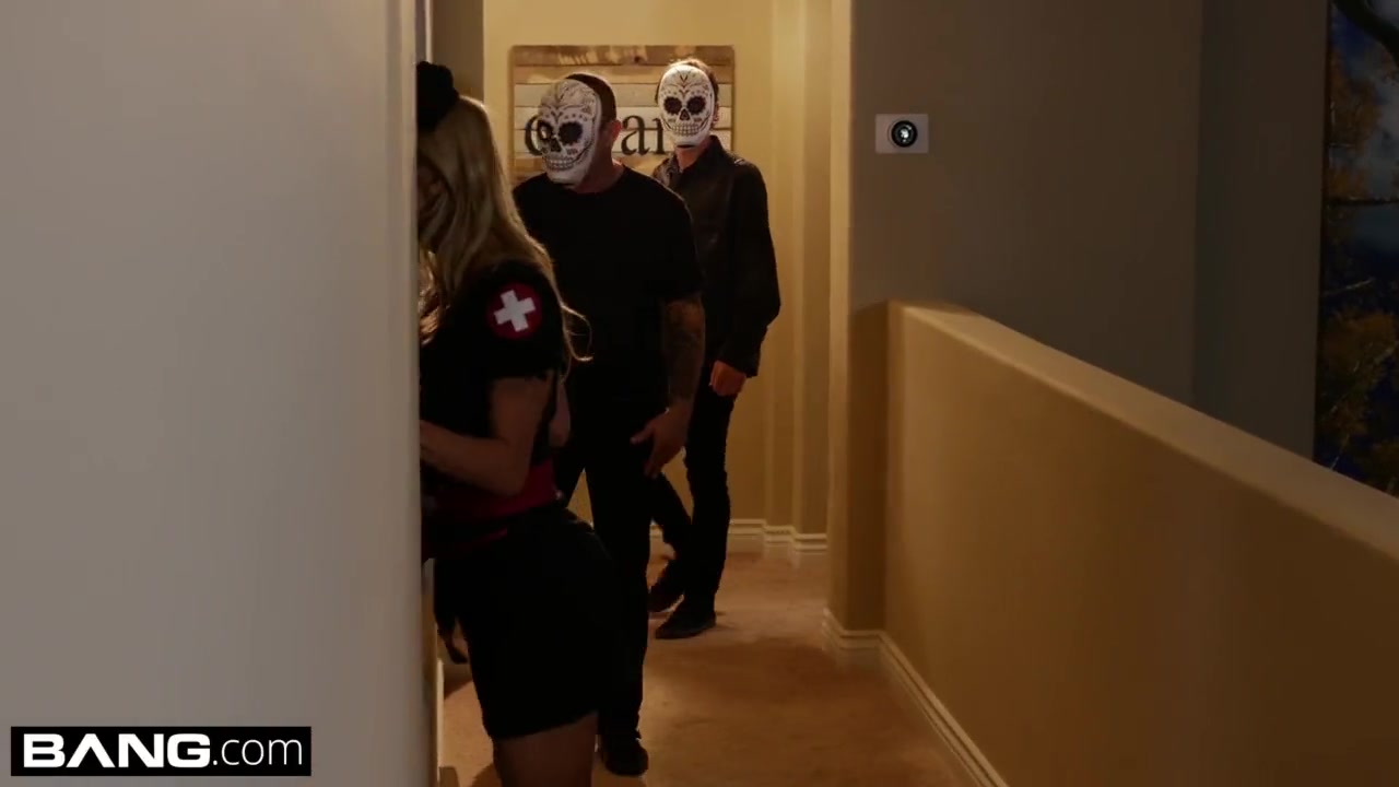 «Изголодавшаяся больших членов блондинка, пригласила к себе в гости двух мужчин, которые наведались к ней в спальню с масками на лице. Данная идея ее еще больше возбудила, что спровоцировало ее стать на коленки и показать как она любит нежно полировать губками, два торчащих елдака у ее милой мордашки. Вскоре один из ухажеров пристроился к цыпочке сзади, начав активно сношать узенькую пилотку отсасывающей девице. Сисястая подруга послушно принимала все позы, мечтая получить в ротик два смачный камшота, сперму которую ей не терпиться проглотить.»